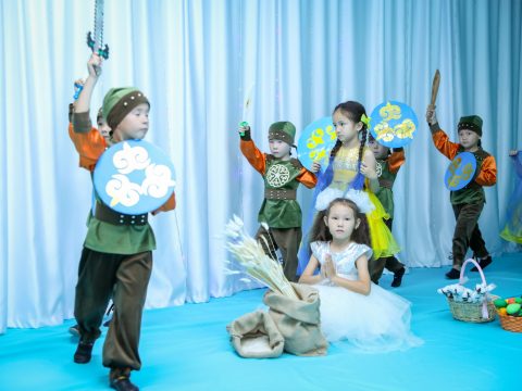 Балалар сахнаға шығып, күй тартып, қимылмен әуенді бейнеледі, суретпен сезімін жеткізді.