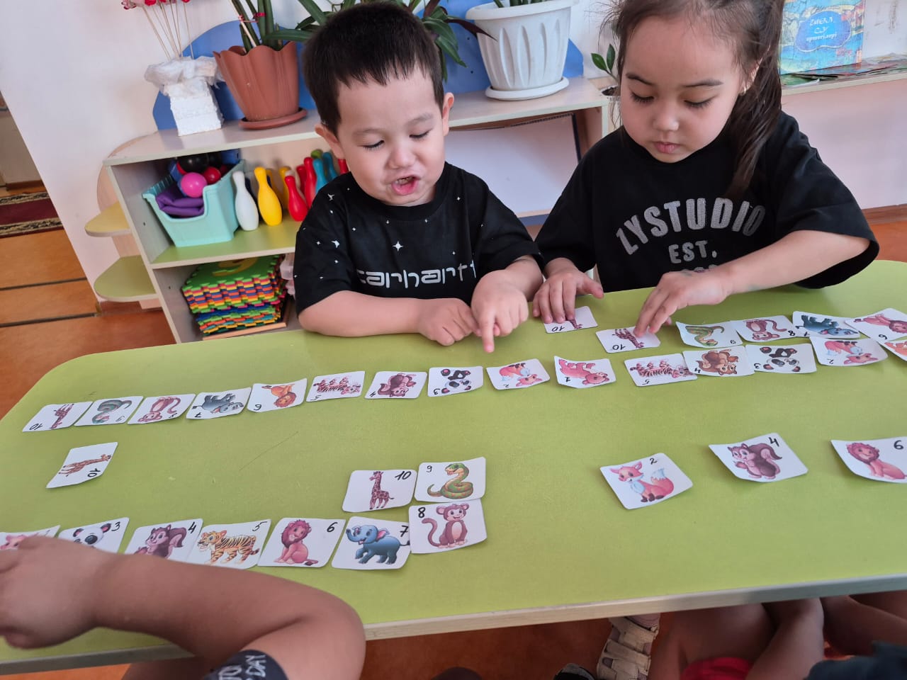 Әр балаға 1-10 ға дейінгі қиылған аңдардың суреттері беріледі.Соны сан реті бойынша  реттеу керек. (Балалар  реттеп қояды.)